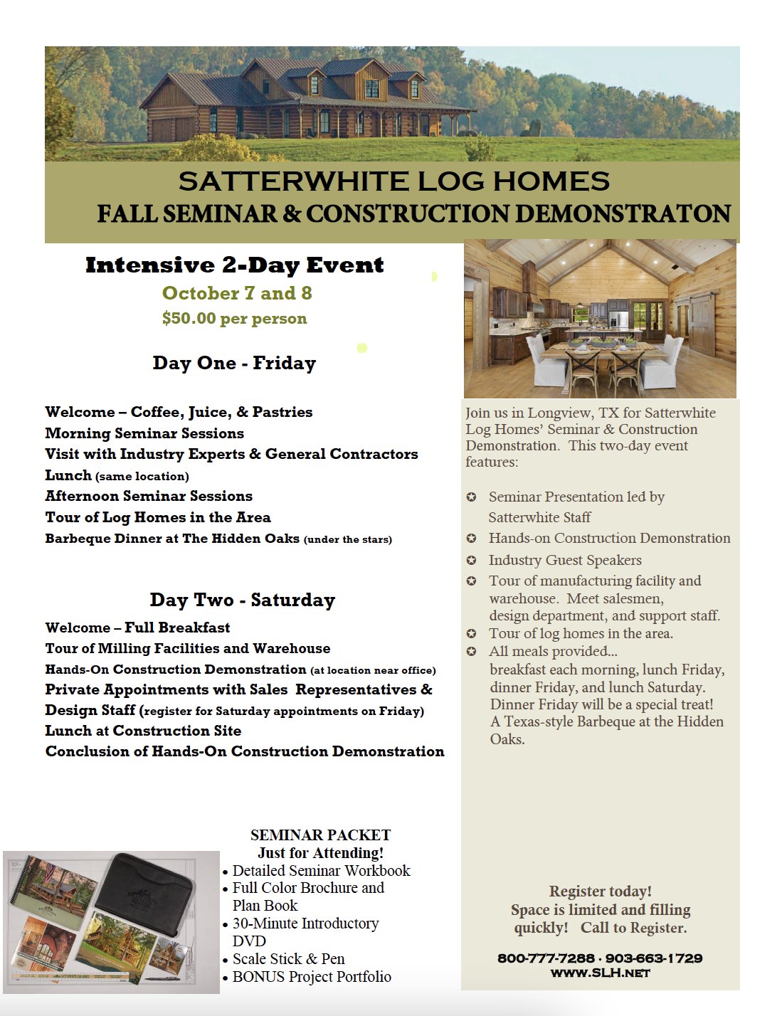 . Satterwhite stocks an amazing range of hard to find specialty woods that are perfect for log home interiors and architectural accents. Satterwhite Log Homes participates in many of these events along with many other builders and suppliers in the log. One of the nations leading log home companies since 1974.
